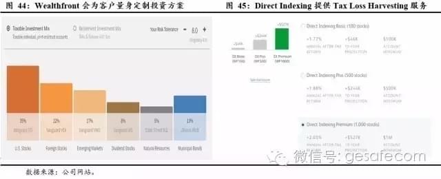 迈向智能:美国的Wealthfront,Betterment开创了人工智能理财产品的先河,即通过优化程序为客户“量体裁衣”,设计组合配置策略;近年来美国大型资管机构也在跟进,如资管巨头Vanguard近年也在大力推进人工智能理财产品。