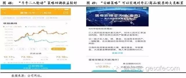 中国的智能投顾也在发展中,目前包括京东金融等机构也参与了人工智能选股和智能配置。除了推荐个股外,相关机构主要还是以“做选择题测算风险偏好—提供风险配置”方案为主,本质上还是一个静态的配置方案。但也有部分机构可以展示策略提供动态化的资产配置过程,我们认为其对资产管理的理解已走到海外同行。我们以雪球研发的蛋卷基金举例说明。