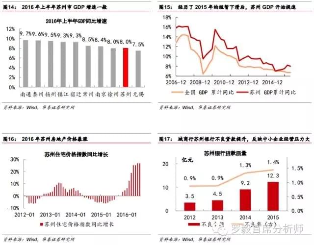 (1)南通9.7%的经济增速在上半年还算不错,但是营改增后财政压力却明显增加。地方经济以造船、化工、纺织为主。民国时期张謇在南通大力引进纺织技术,为南通留下了扎实的工业基础。纺织行业的民营企业众多,集聚效应明显,倾向于通过担保圈的形式进行融资。2012-2014年苏南地区首先出现不良风险爆发的高峰期,南通则是从2015年开始出现链条式(担保圈)的风险暴露。担保圈带来的不良风险连锁反应对地方经济有一定影响。但是银行根据前几年处置不良贷款的经验,已经提前做好风险防范,不良率依然处于较低水平。不良风险爆发的原因有两个,第一是缺少自主品牌,自身销售增长乏力,受电商冲击大,人工成本增加;第二是南通外向型经济比较明显,南通纺织产品产量约占国内50%,交易量占全球30%,终端需求受到国外市场疲软和汇率波动的影响。地方银行业预计不良风险爆发还要2-3年时间。地方纺织企业对主业发展依然乐观,转换行业的很少;更多的是积极进行产业升级和将生产线向人力成本更低的区域转移,比如西部地区和东南亚等。